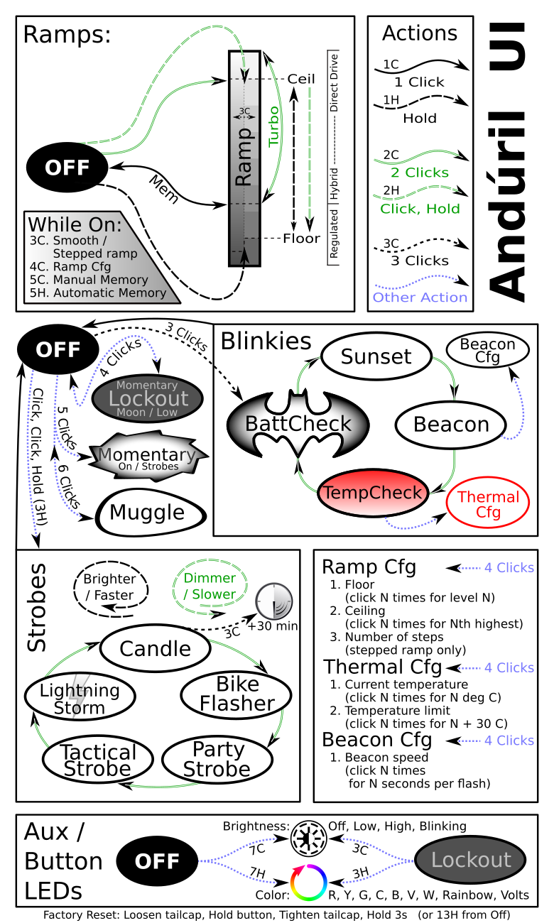 - Lockout recommended during carry to prevent accidental activation (see Andúril tips below, or just loosen the tailcap).
